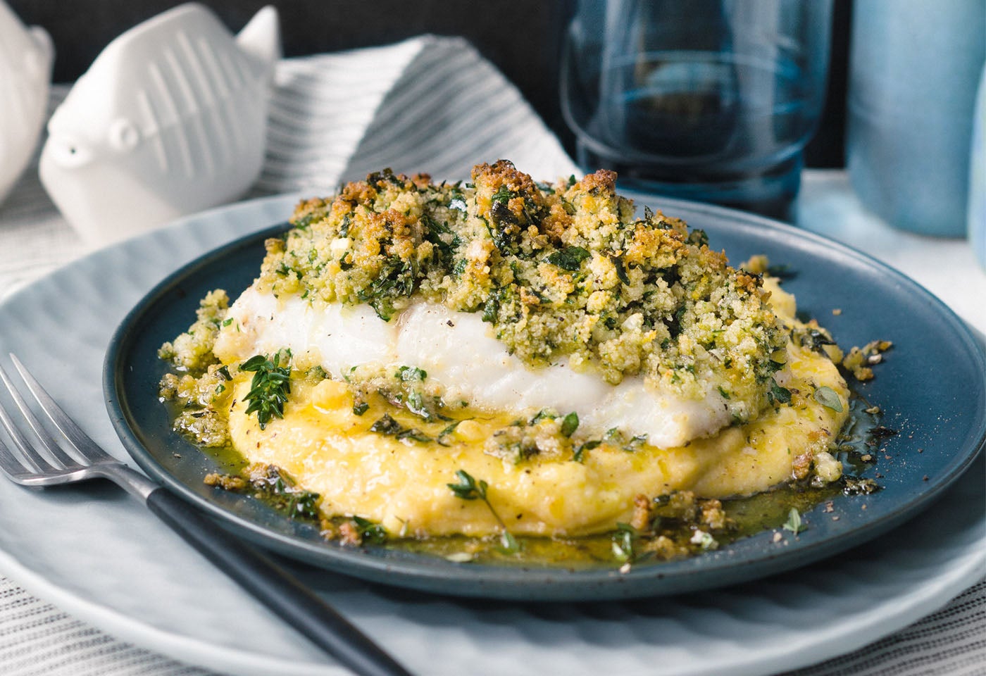 Gratinierter Dorsch mit Kräuterkruste und Polenta