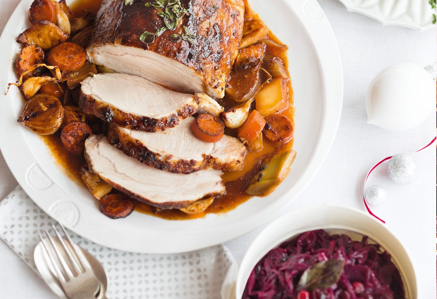 Schweinskarree mit Cranberry-Rotkraut und Serviettenknödeln