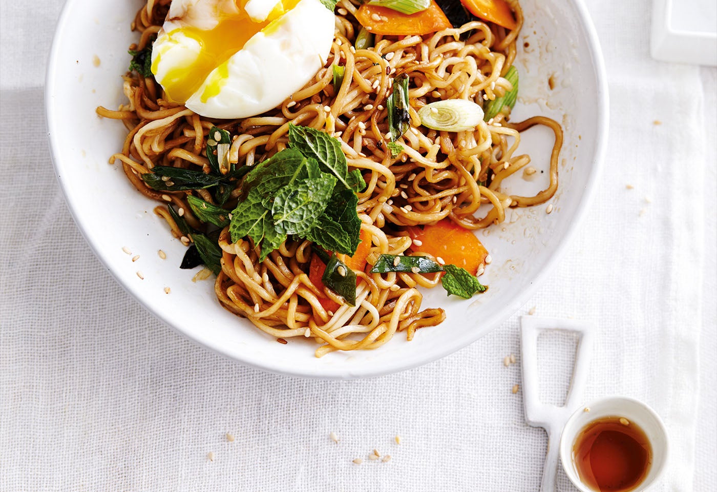Gebratene Nudeln mit Sesam, Ingwer, Ei und Gemüse