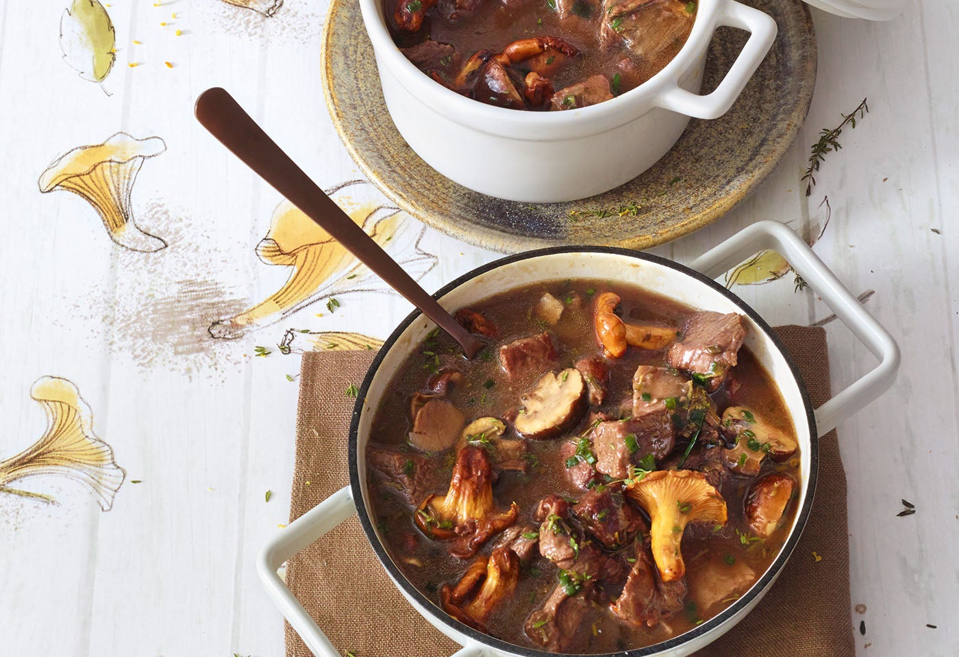 Saftfleisch mit Pilzen, Wein und Kräutern
