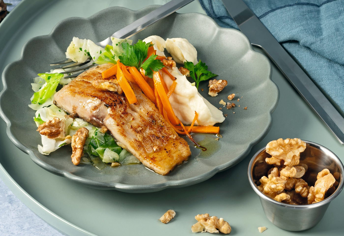 Weihnachtskarpfen aus dem Ofen mit Bierkraut und nussigem Selleriepüree