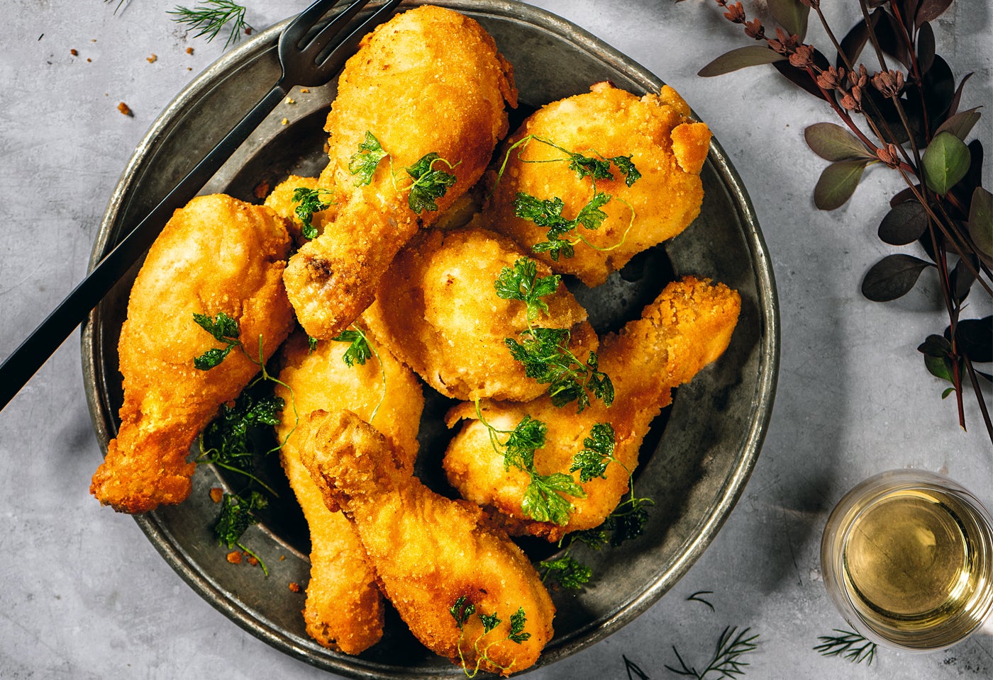 Gebackene Buttermilch-Hendlkeulen mit Erdäpfel-Rahm-Salat