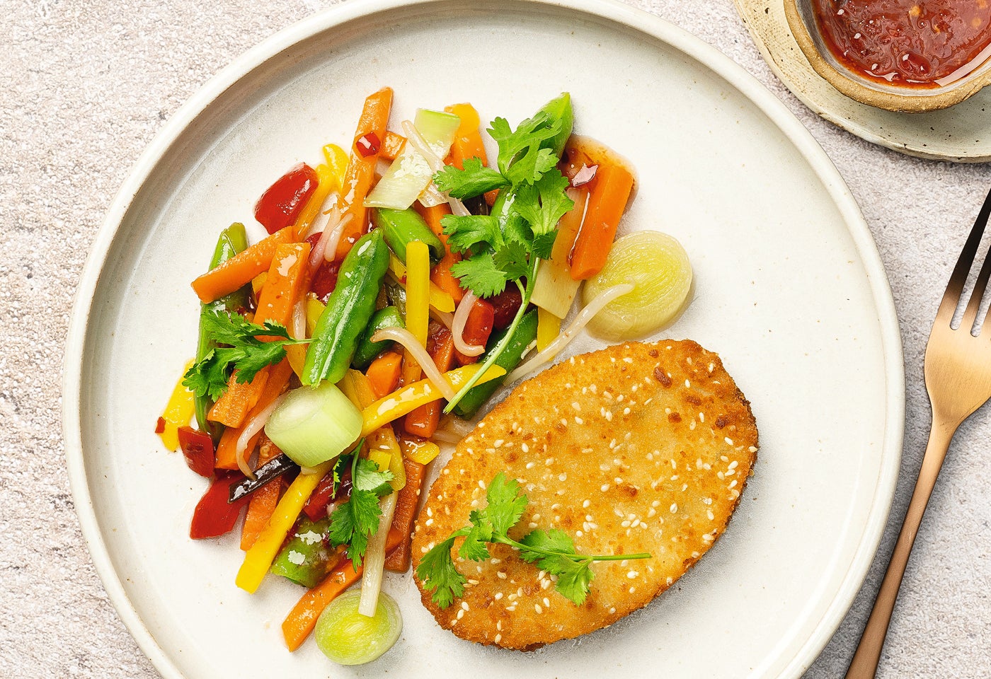 Karfiol-Käse-Laibchen mit Wok-Gemüse süß-sauer