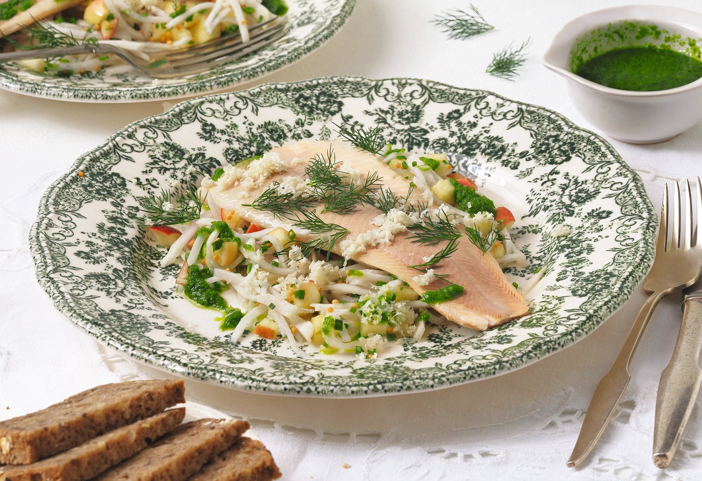 Kurz gebeizte Forelle mit Apfel-Kohlrabi-Pickles
