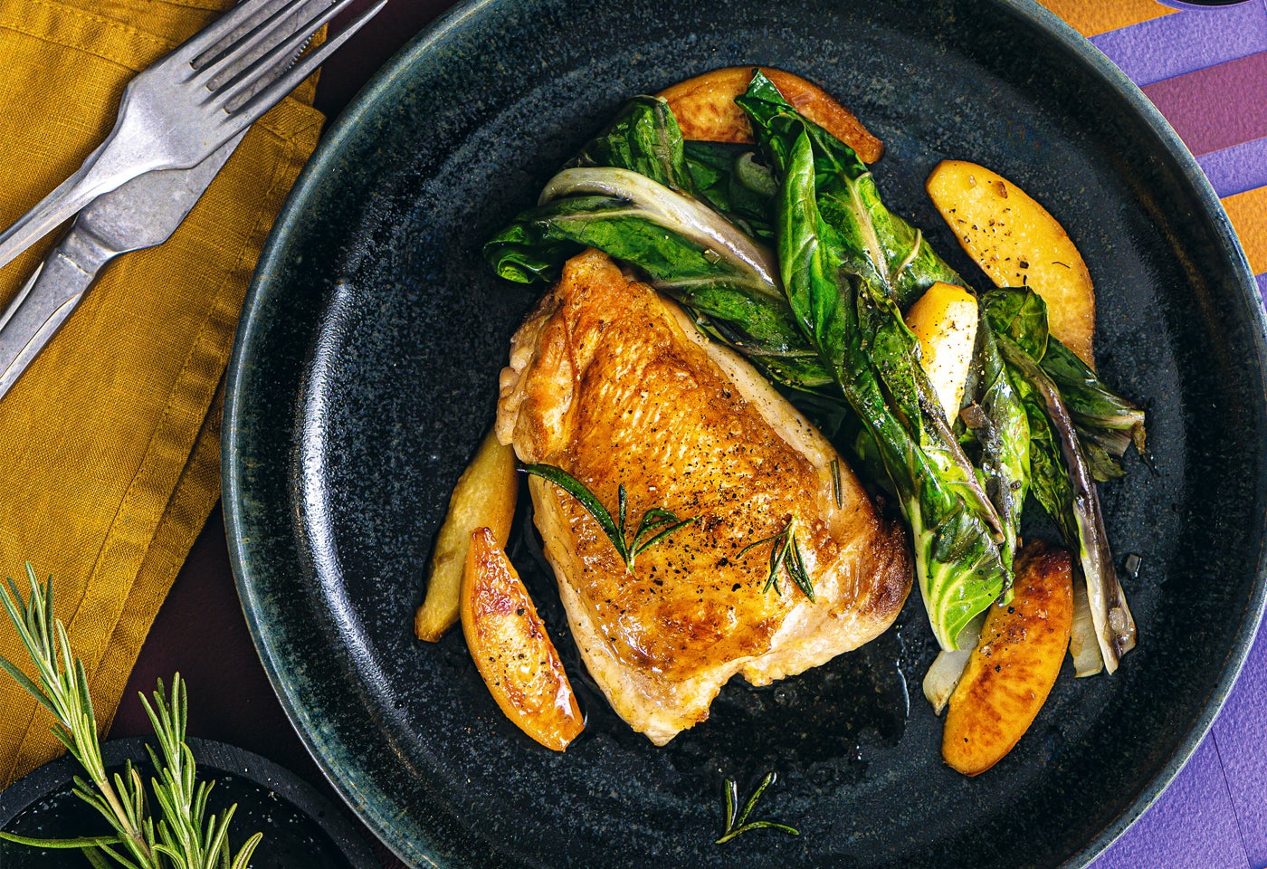 Gebratene Hendl-Oberkeulen mit Mangold und Quitten