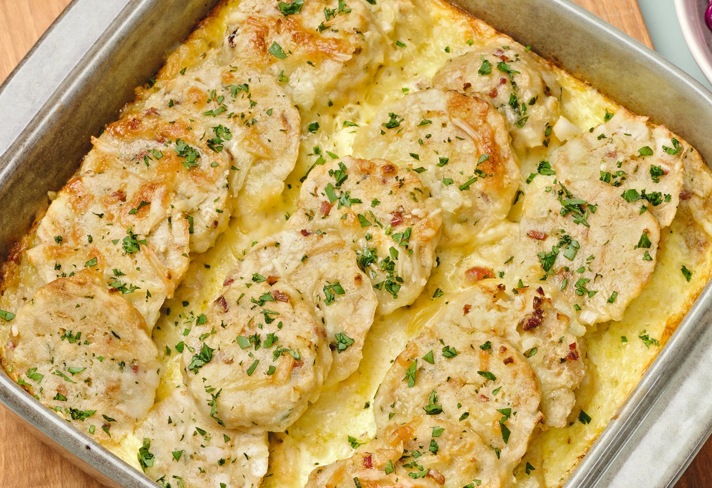 Bergkäse-Knödel-Auflauf mit Rotkrautsalat
