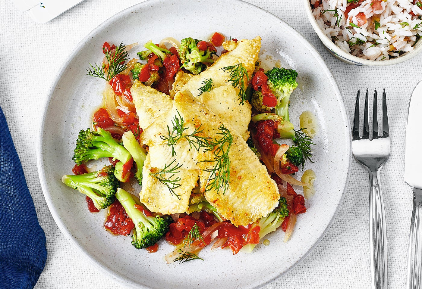 Gebratene Scholle mit Tomaten-Brokkoli-Gemüse und Kräuterreis