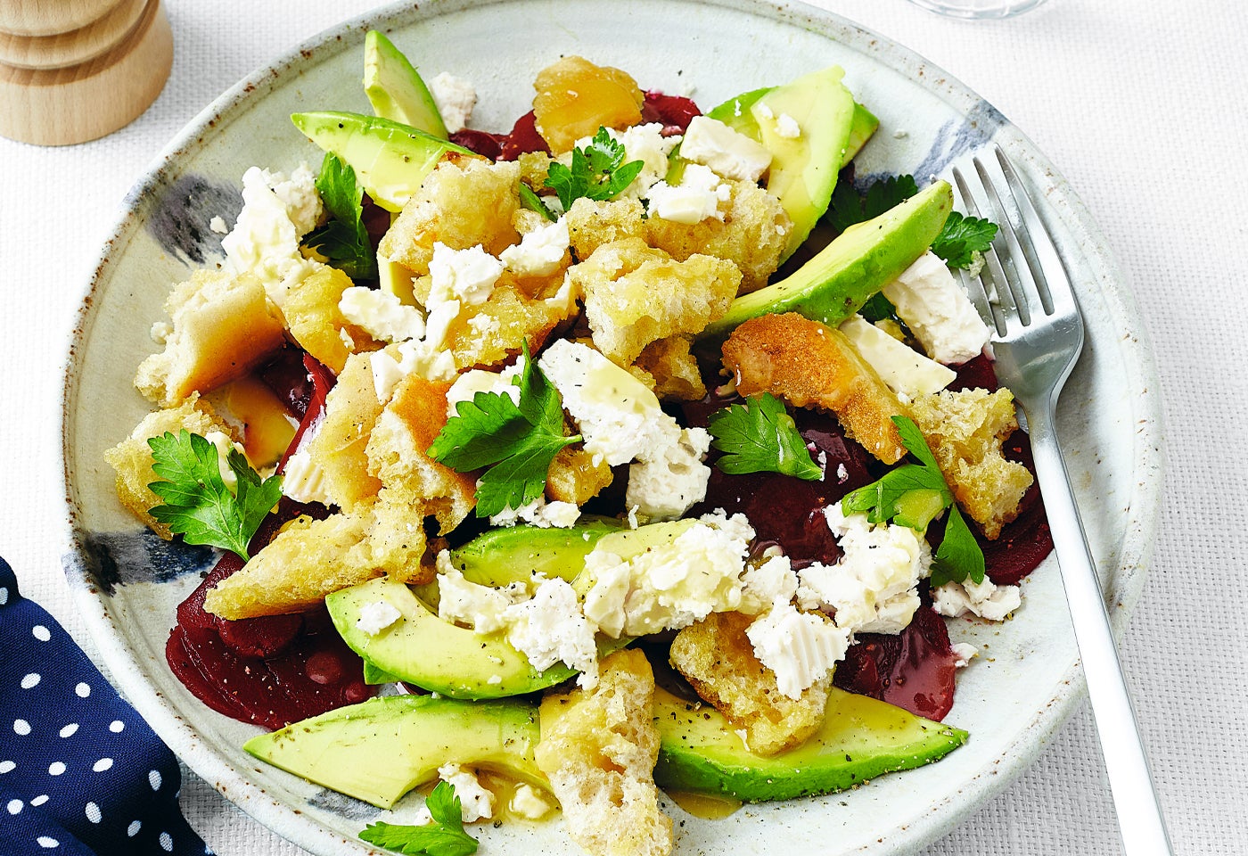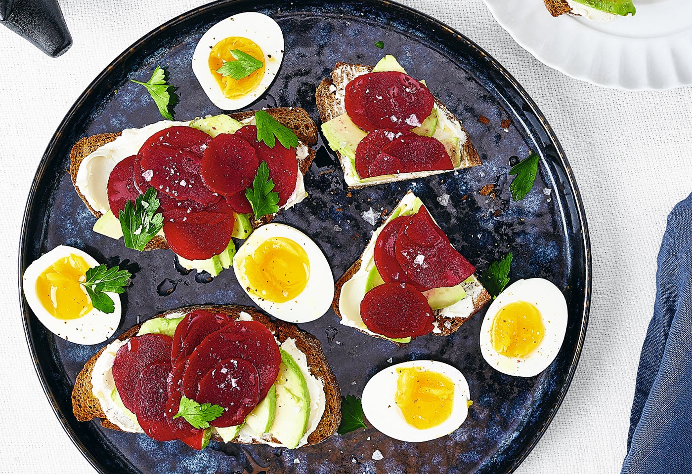 Knuspriges Avocado-Brot mit Roten Rüben und wachsweichem Ei