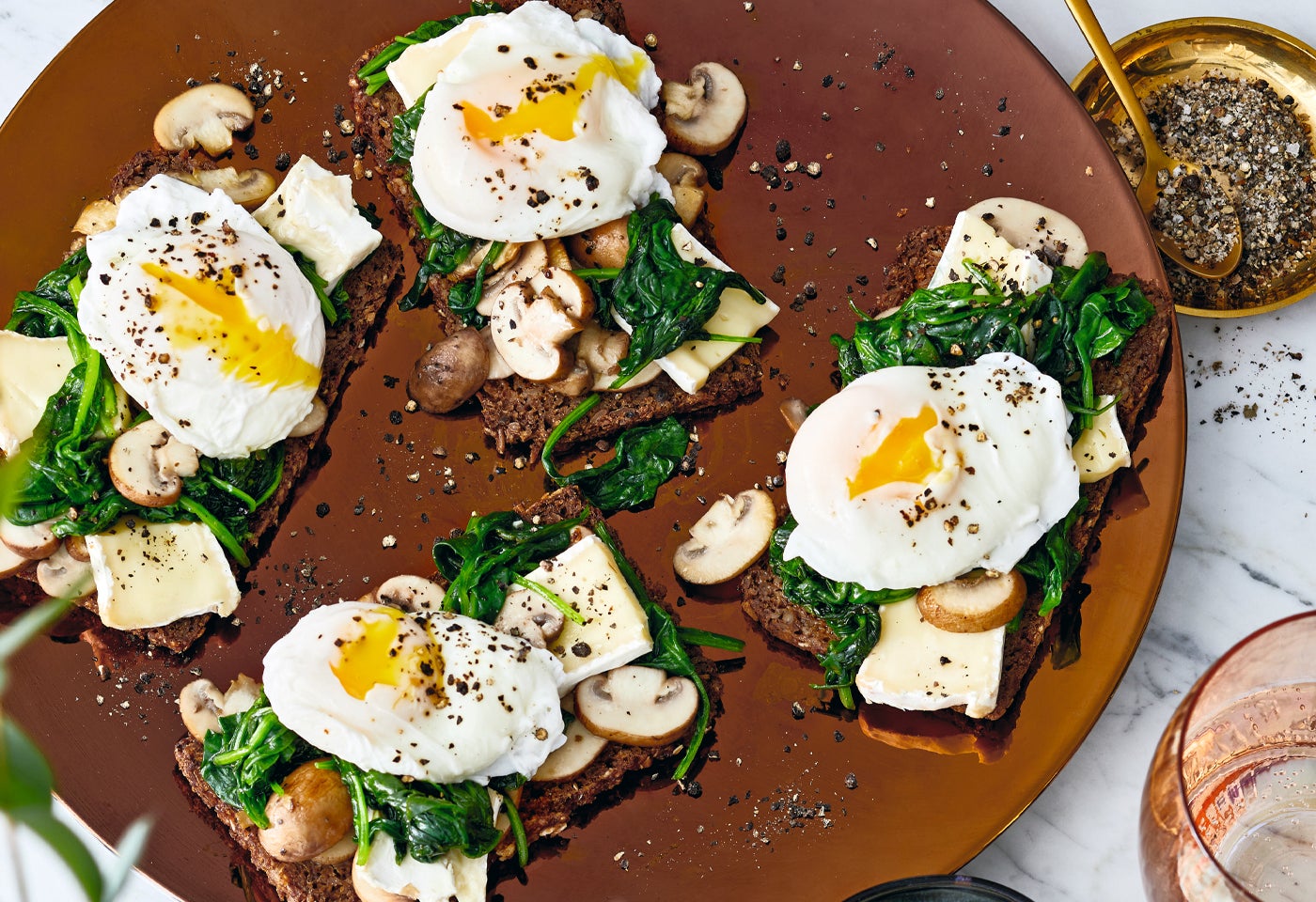 Belegtes Vollkorn-Röstbrot mit Champignons, Spinat und pochiertem Ei