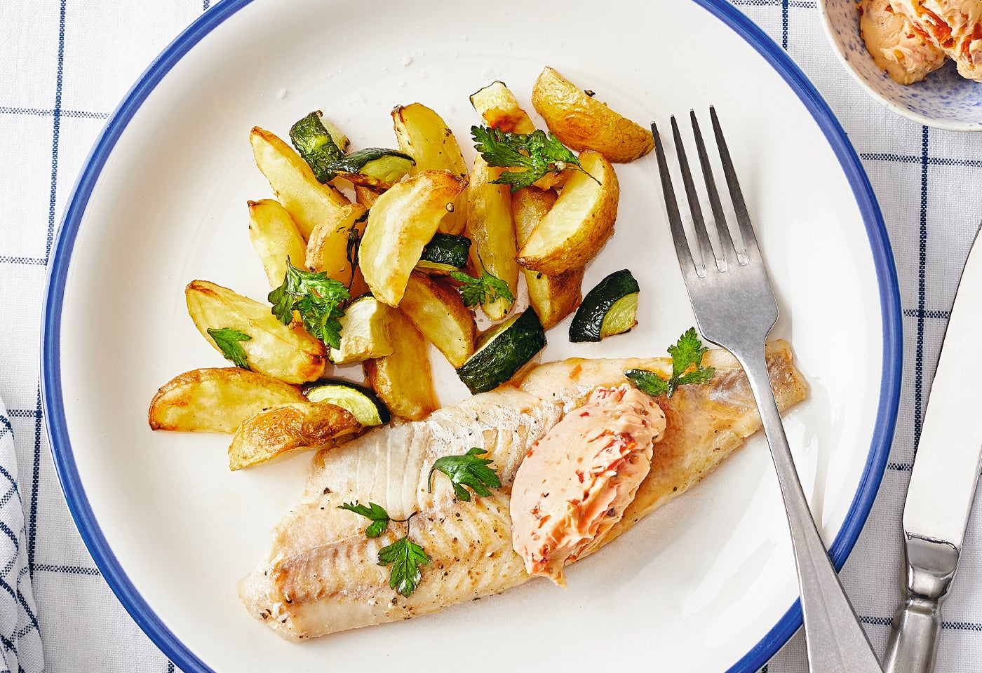 Gebratenes Pangasiusfilet mit Ofengemüse und Sardellenbutter