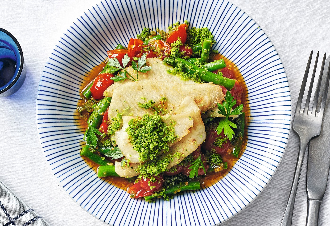 Gebratenes Schollenfilet mit Tomaten-Bohnen-Gemüse