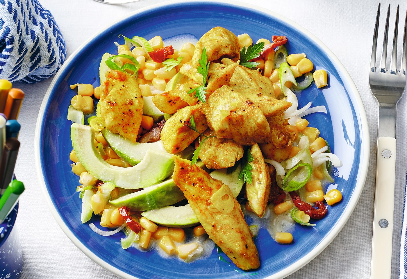 Pikante Hühnerfilets auf Avocado-Mais-Salat