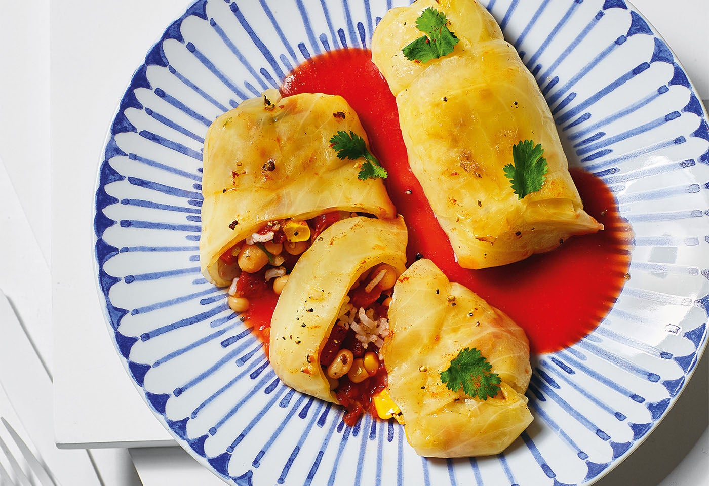 Krautwickel mit Gemüse-Reis-Füllung und Tomatensauce