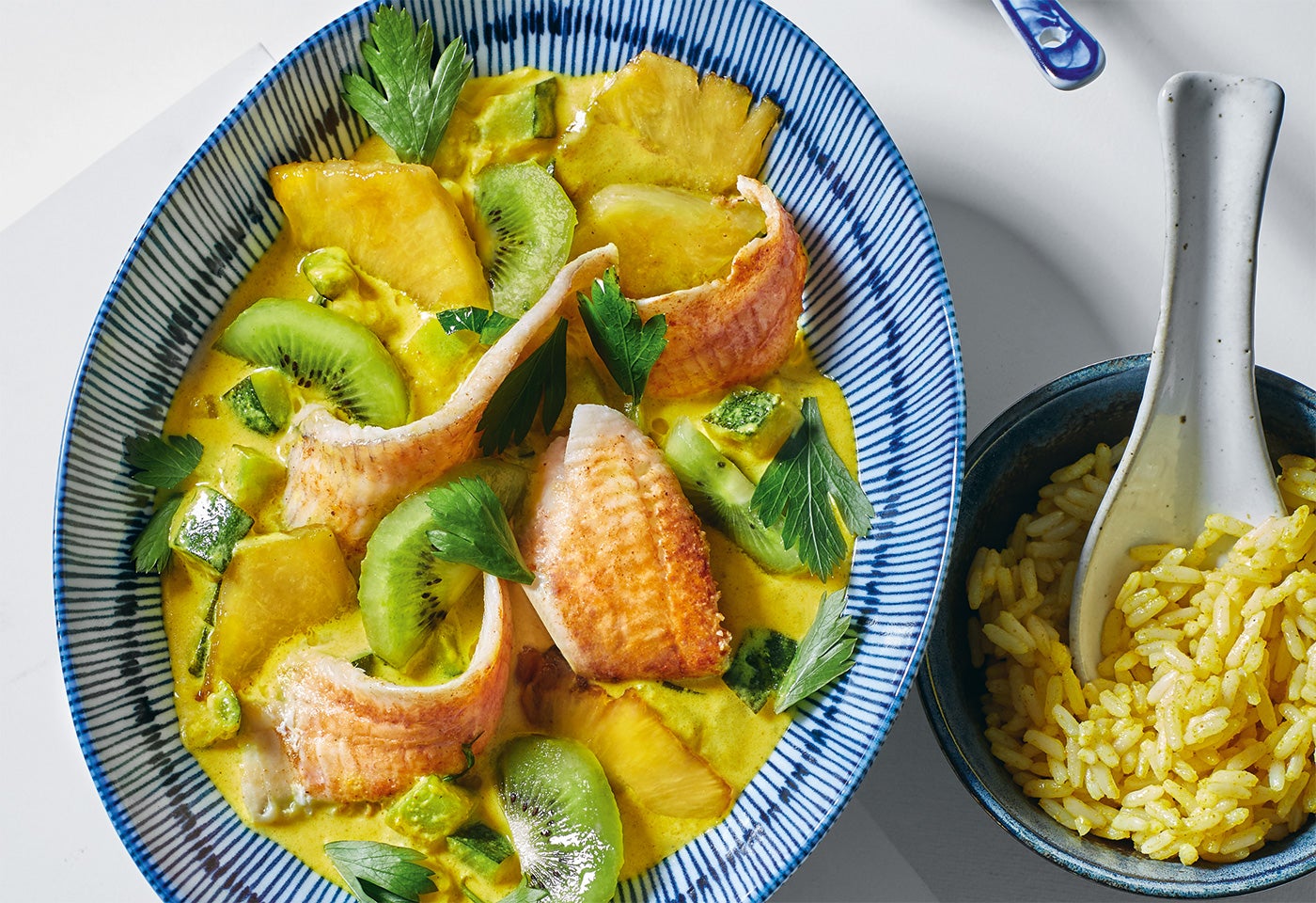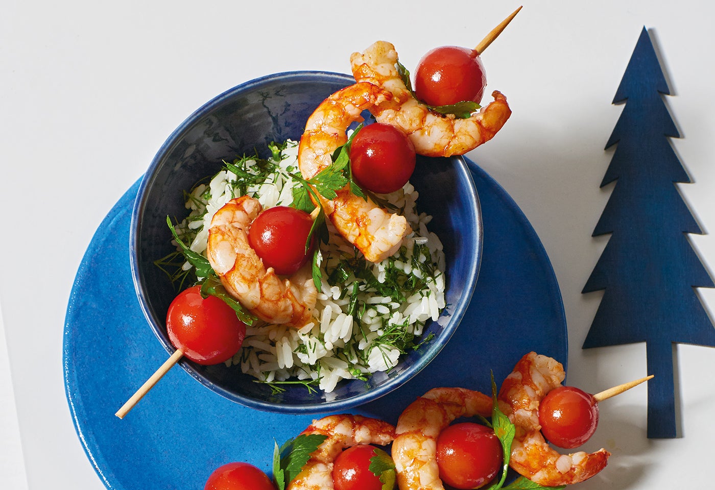 Garnelen-Tomaten-Spiesse mit Kräuterreis und Ananas-Paprika-Gemüse