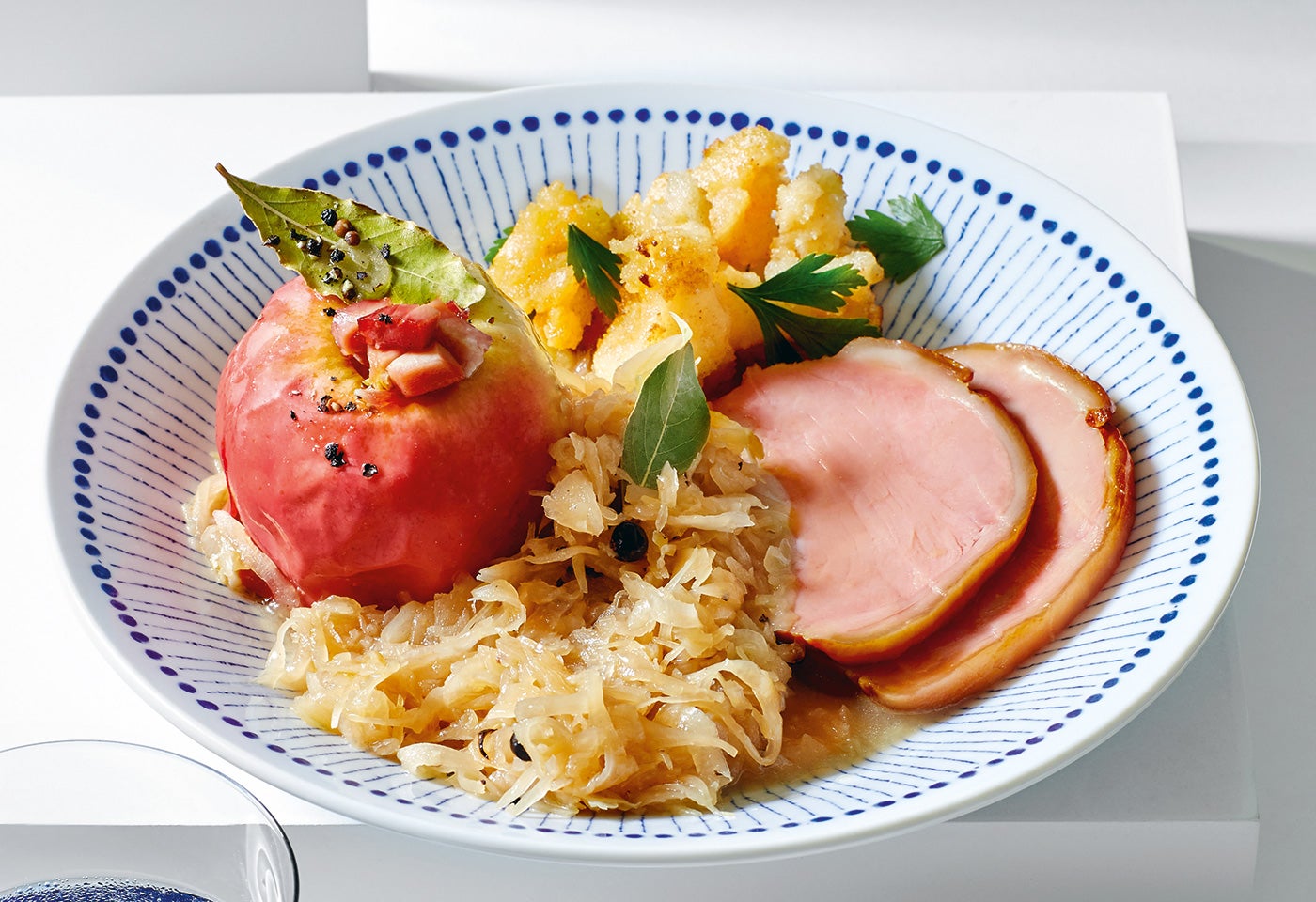 Selchroller mit Bratapfel-Sauerkraut und Grießsterz