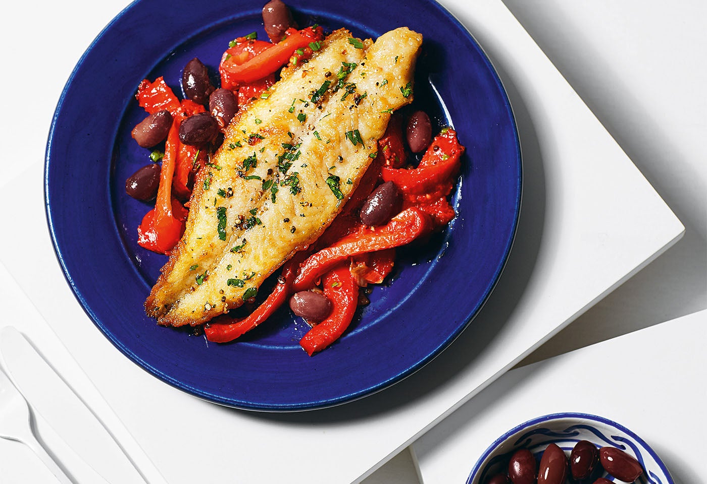 Gebratenes Pangasiusfilet mit Paprika-Oliven-Gemüse