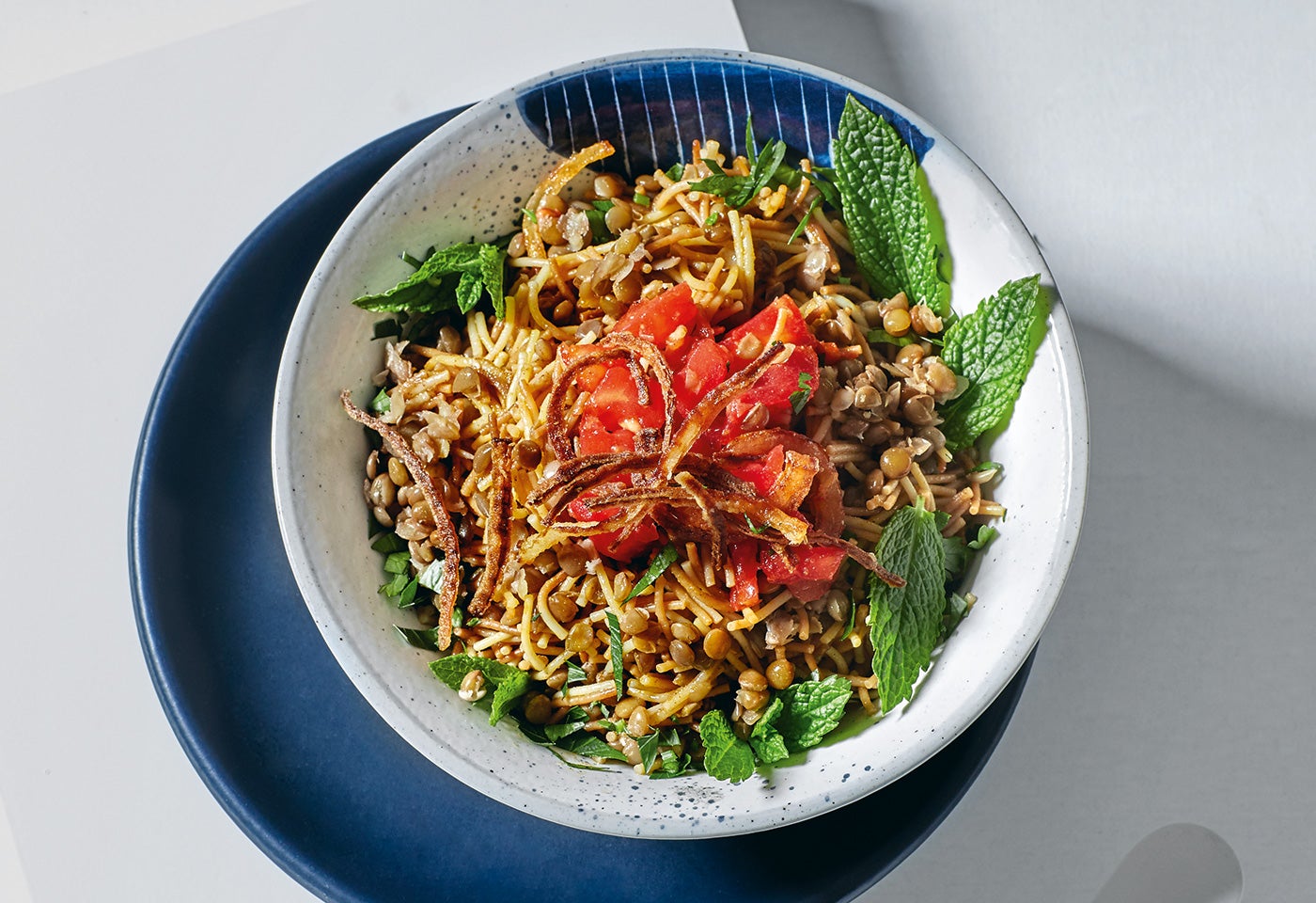 Orientalische Fadennudeln mit Linsen und Röstzwiebeln