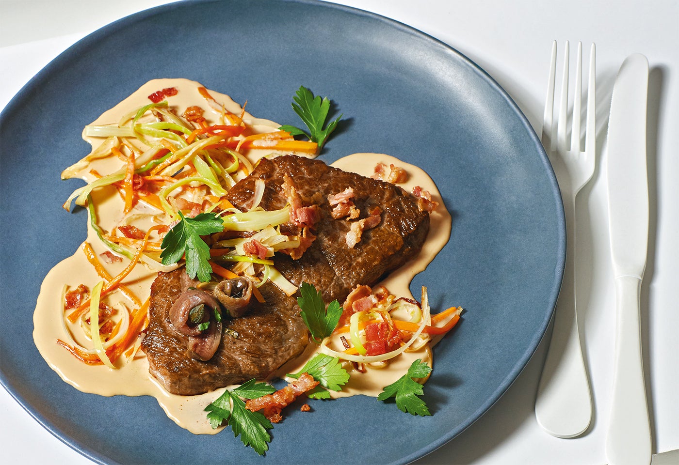 Gedünstetes Rindsschnitzel mit Paprikagemüse und Eiernockerln