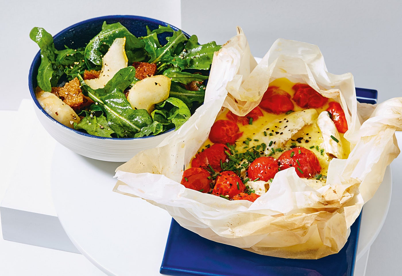Geschmolzener Blauschimmelkäse mit Cherrytomaten und Birnen-Rucola-Salat