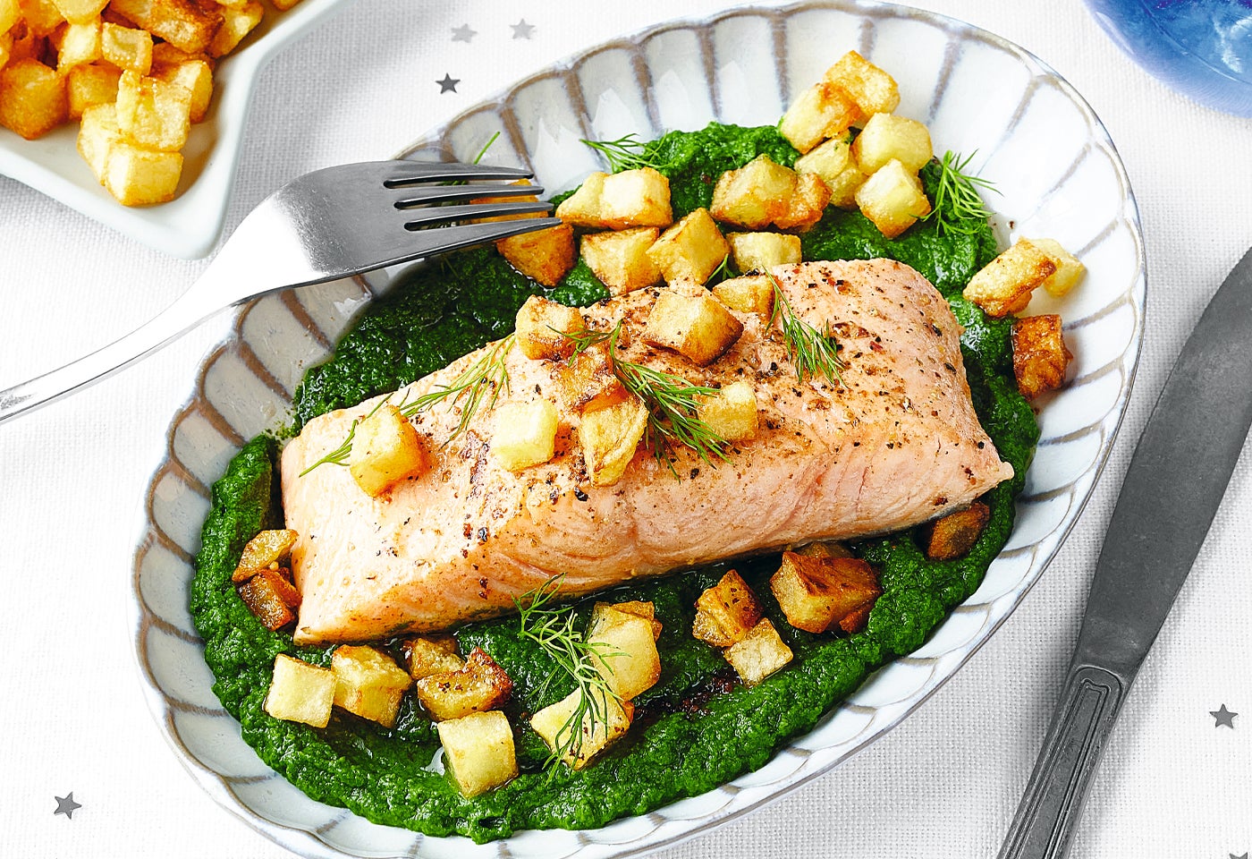Gebratenes Lachsfilet mit Cremespinat und knusprigen Erdäpfeln