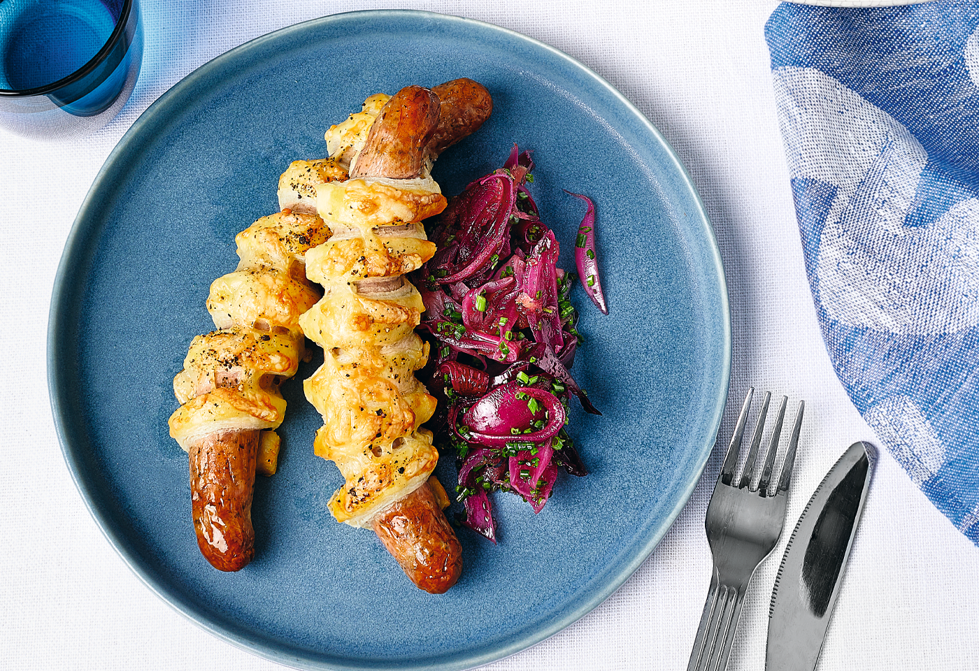 Bratwürstel im Schlafrock mit Zwiebelchutney