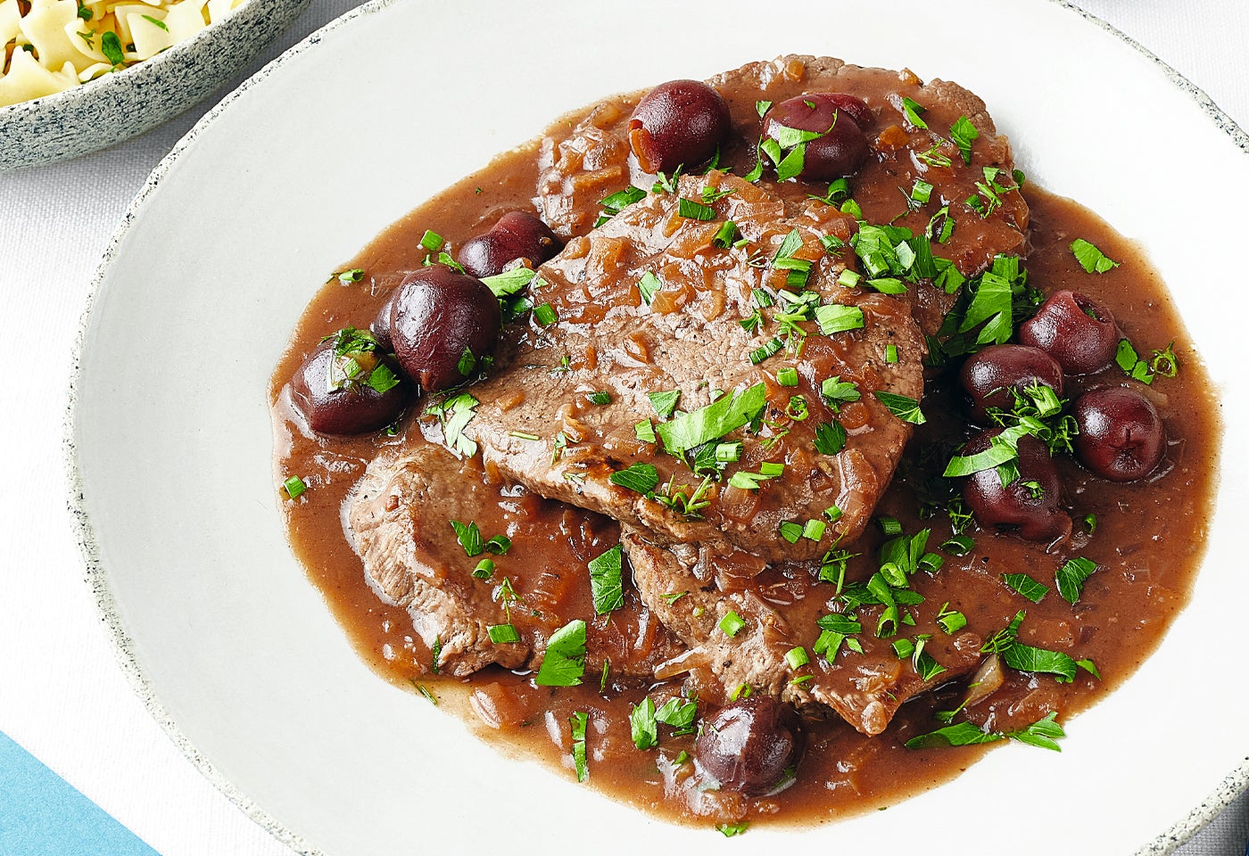 Rotwein-Rindsschnitzel mit Rotkraut und Kräuterfleckerln