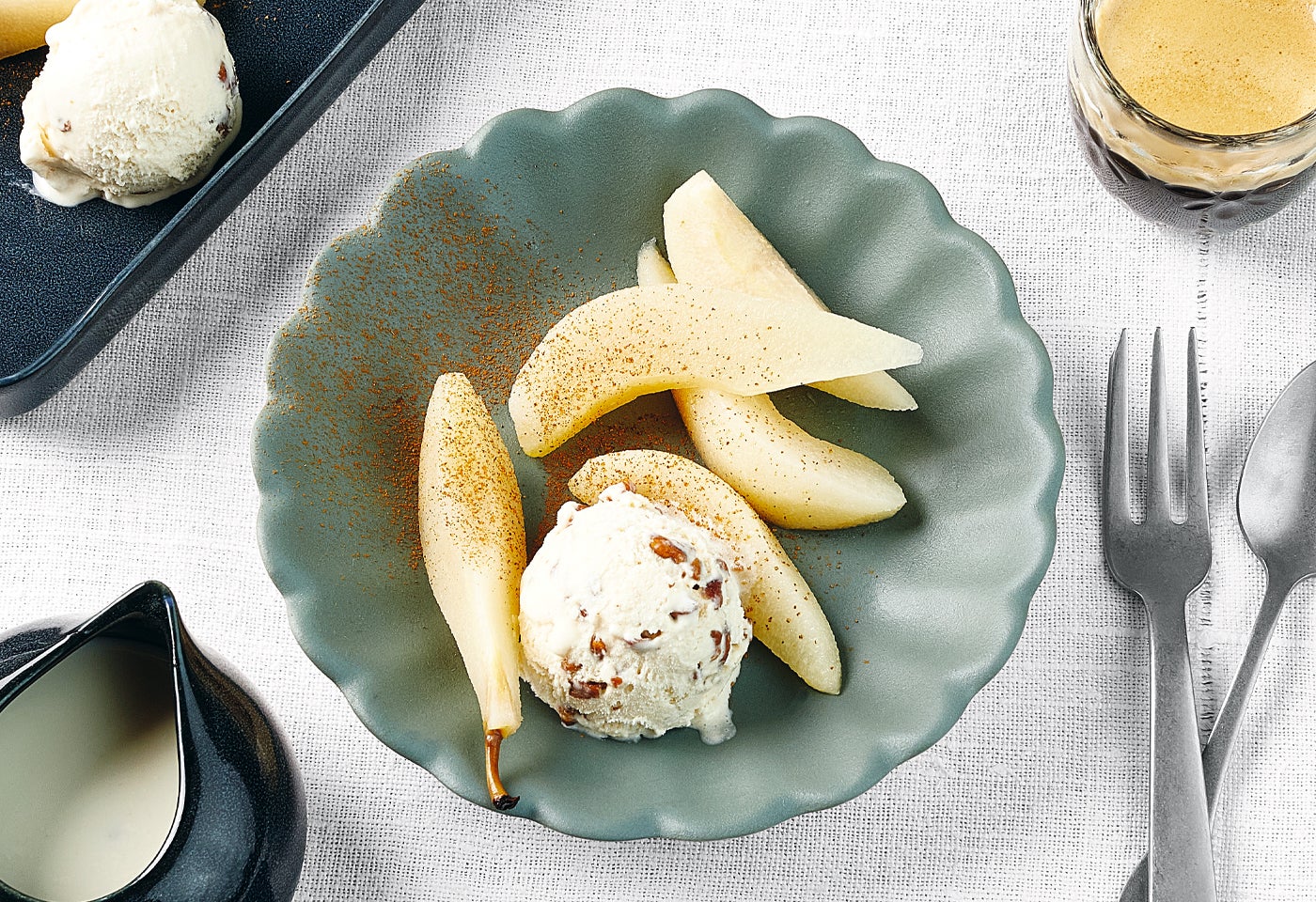 Weißweinbirnen mit Walnusseis