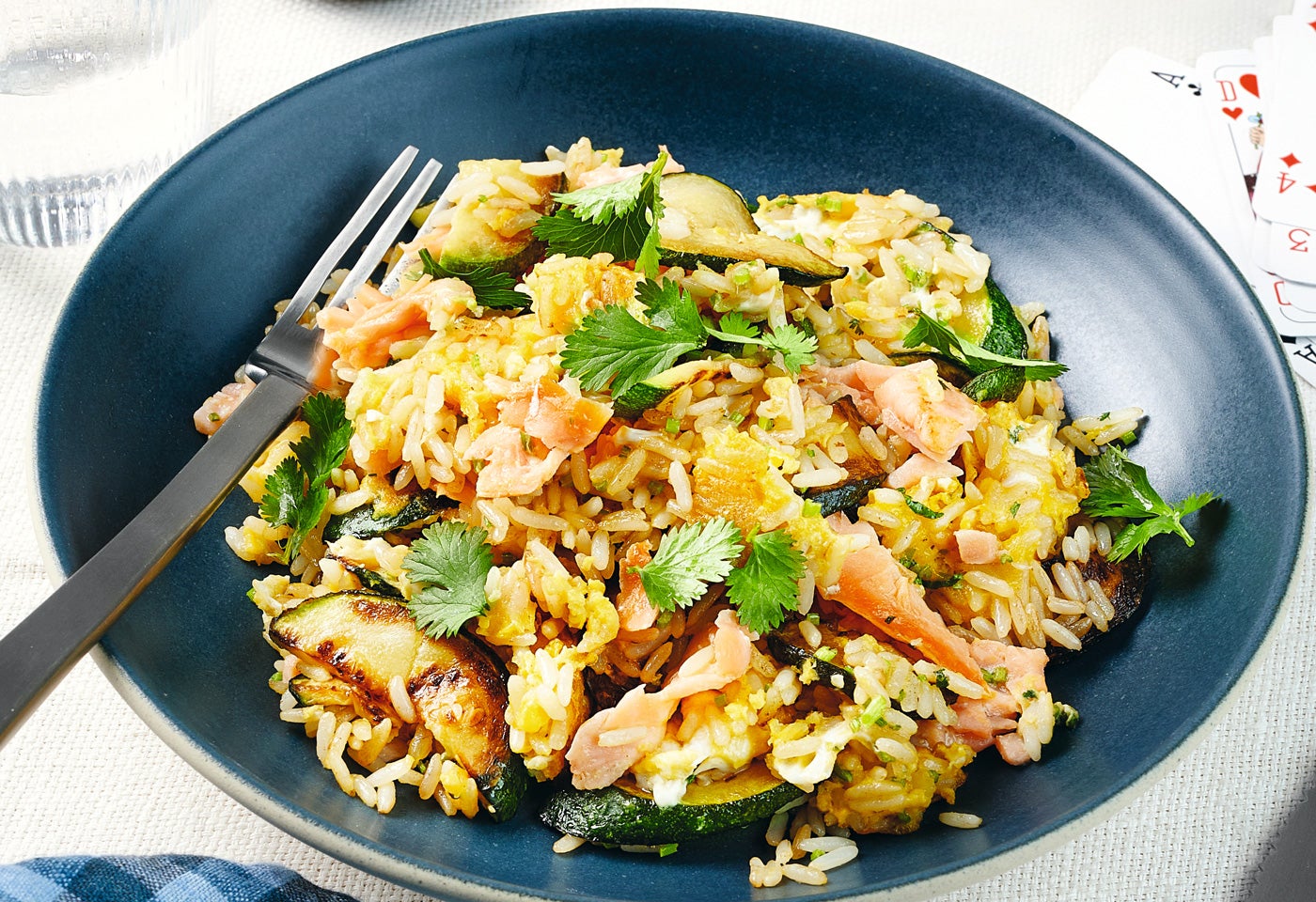 Gebratener Eierreis mit Zucchini und Räucherlachs