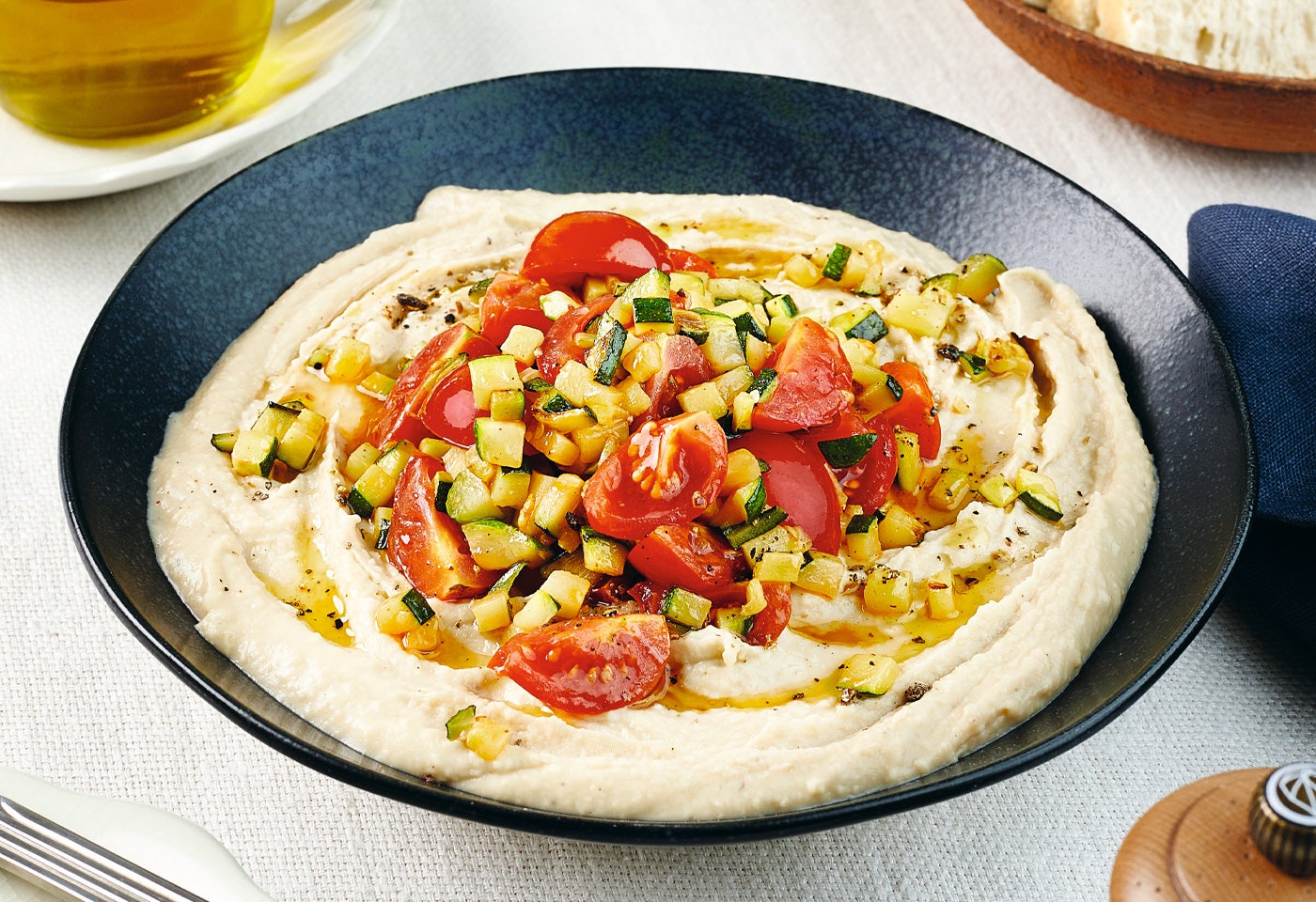 Weiße-Bohnen-Hummus mit gebratenen Zucchini und Cherrytomaten