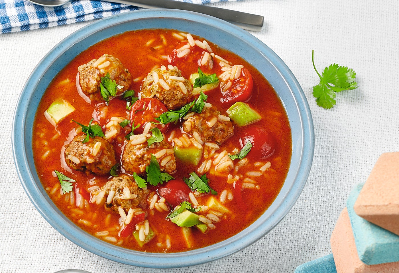 Fleischbällchen-Suppe mit Reis und Avocado