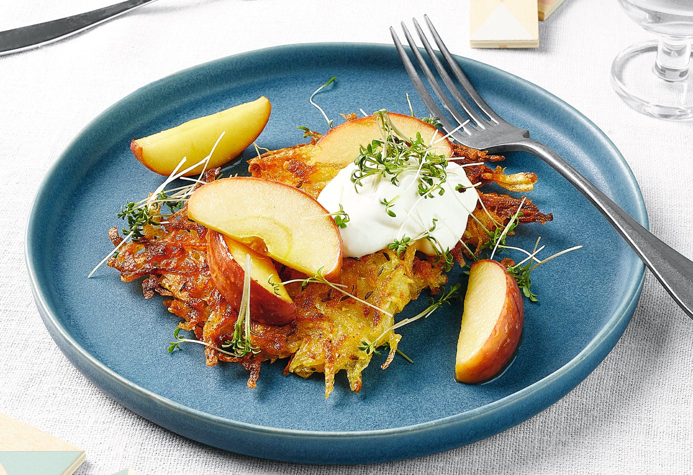Erdäpfelpuffer mit Honigäpfeln und Krenrahm