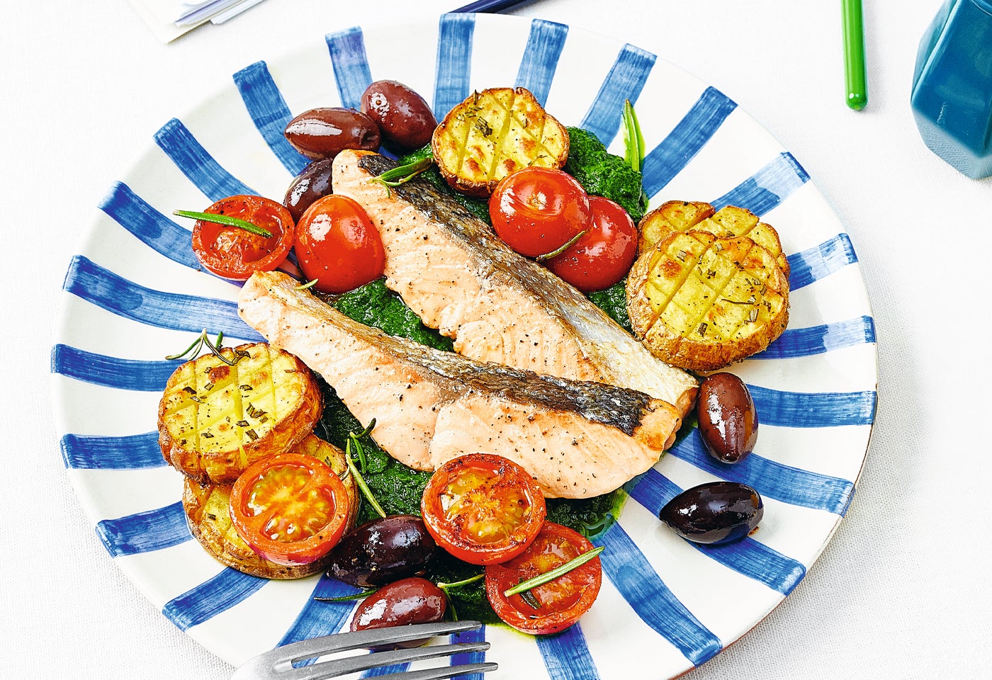 Gebratenes Lachsfilet mit Cremespinat und Rosmarin-Erdäpfeln