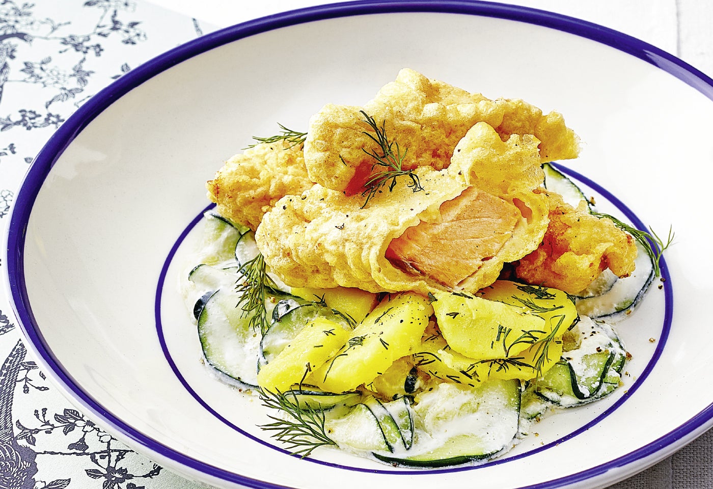 Lachs im Backteig mit Zucchini-Rahmgemüse