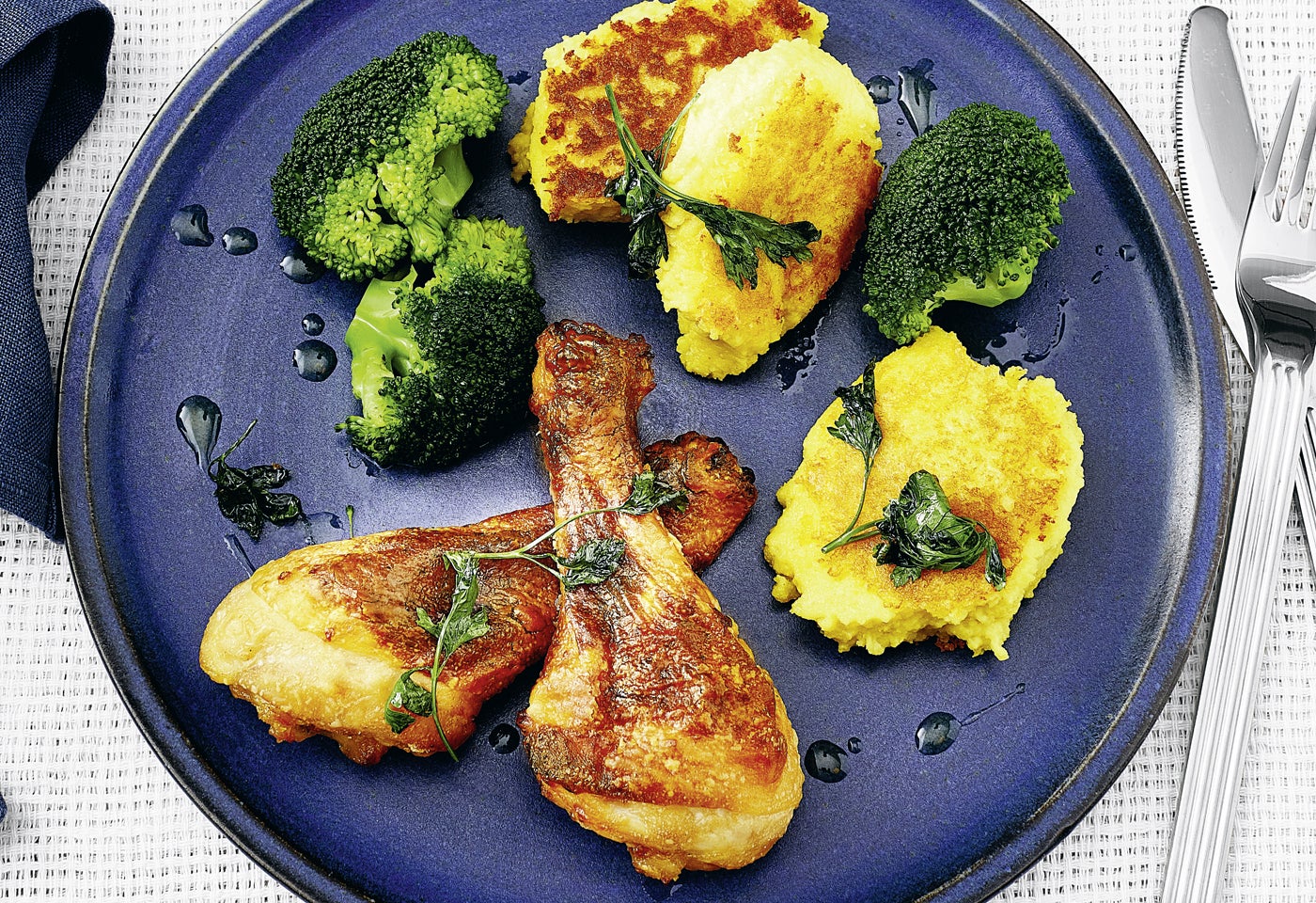 Knusprige Hendlkeulen mit gebratenem Erdäpfelpüree und Brokkoli