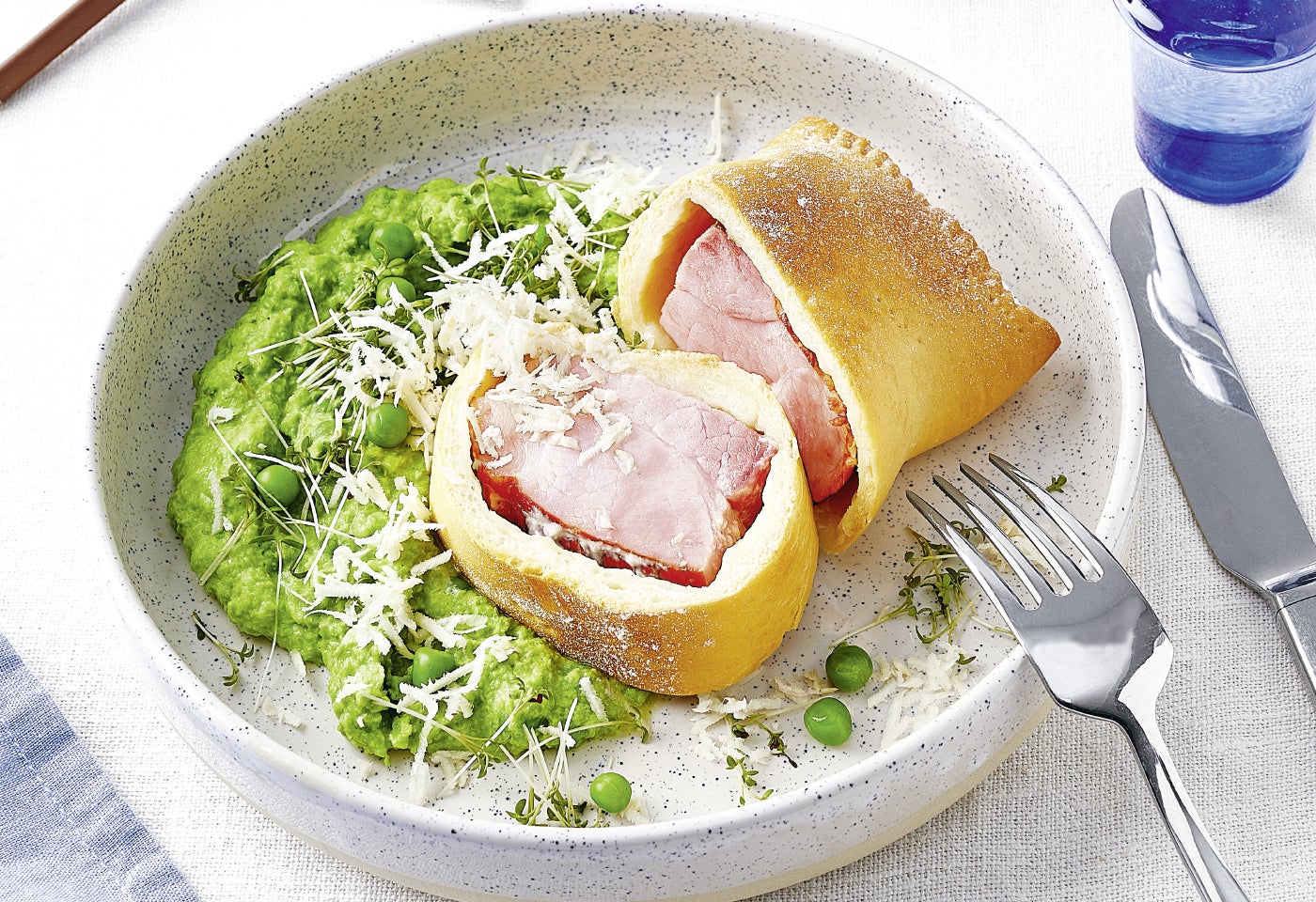 Österlicher Selchroller im Pizzateig mit Erbsenpüree