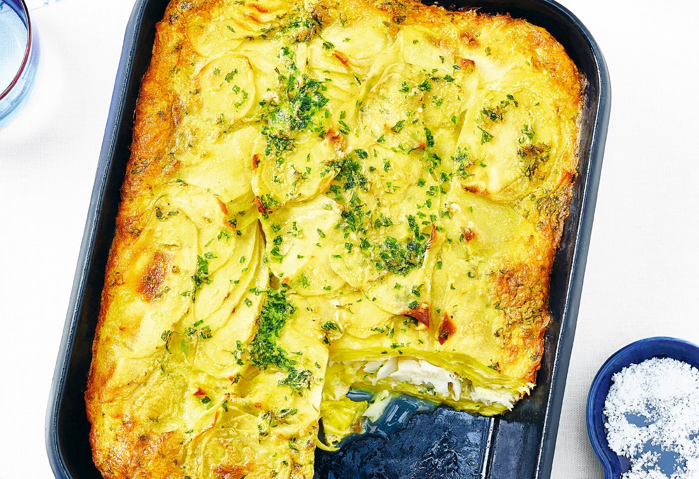 Erdäpfel-Seelachs-Auflauf mit Erbsen-Tomaten-Gemüse