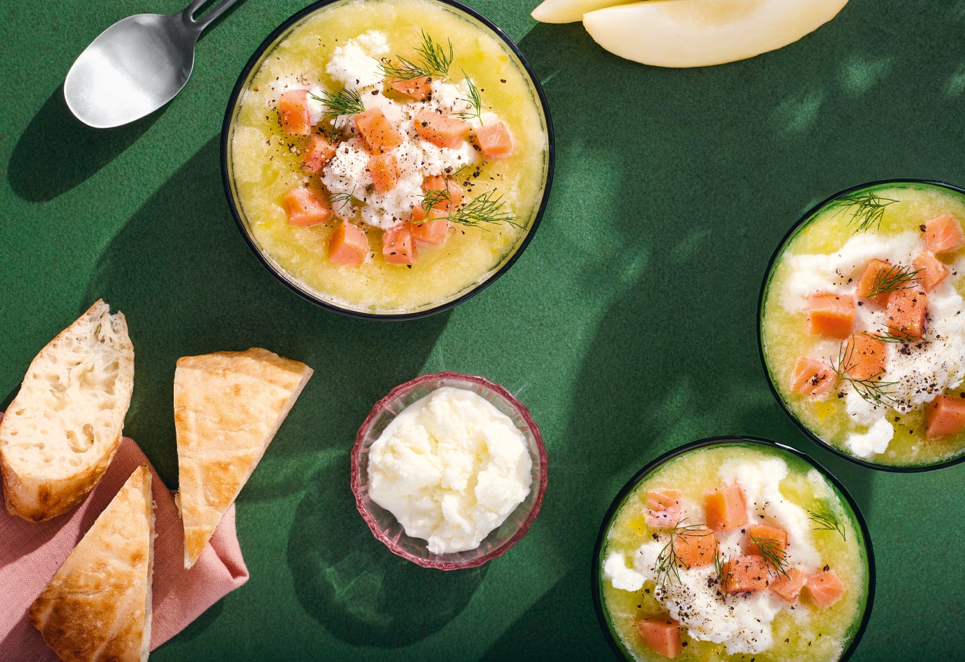Geeiste Honigmelonensuppe mit Ayran-Granita und Sashimi-Lachs