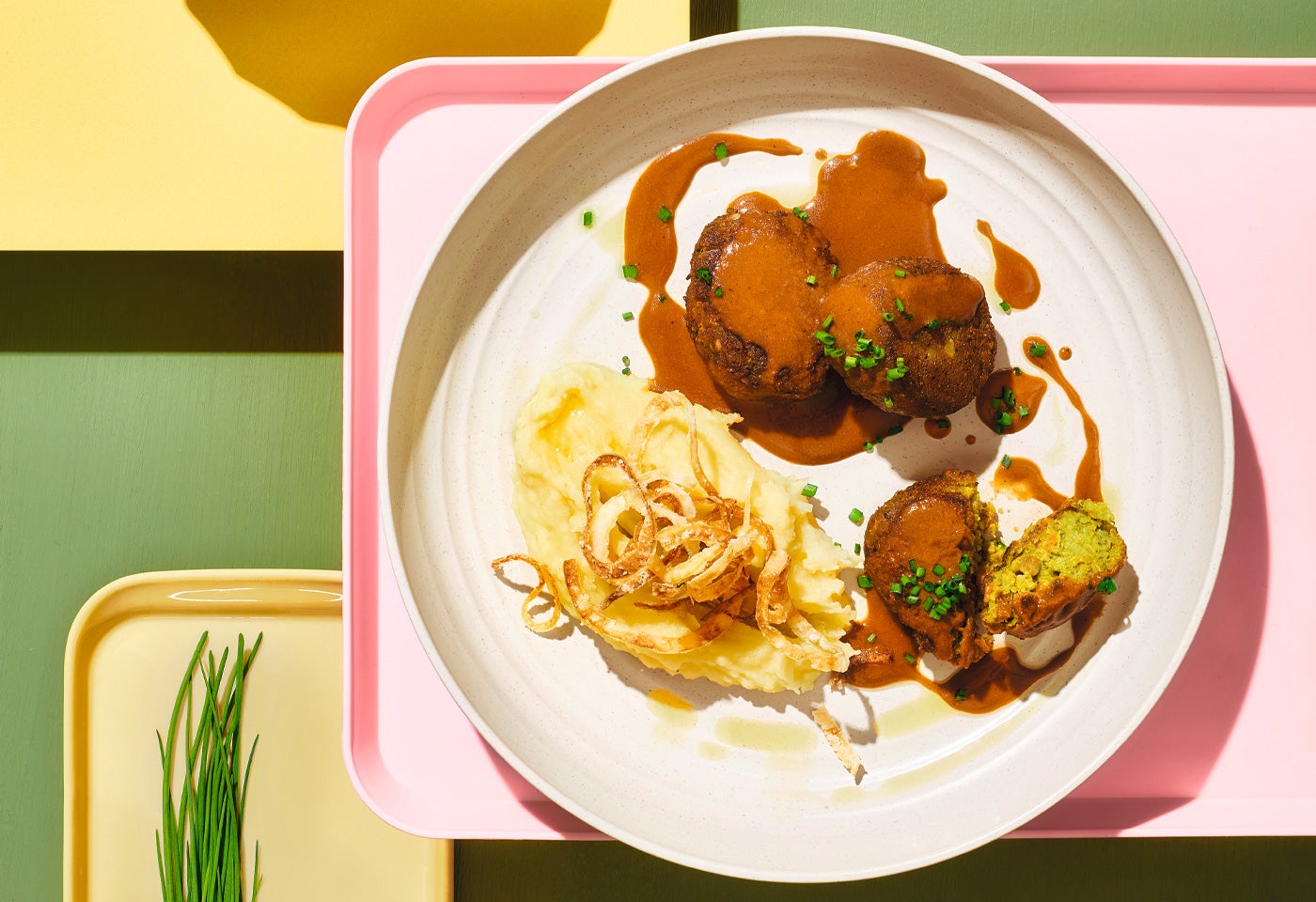 Mini-Quinoalaibchen mit Röstzwiebeln und Erdäpfelpüree
