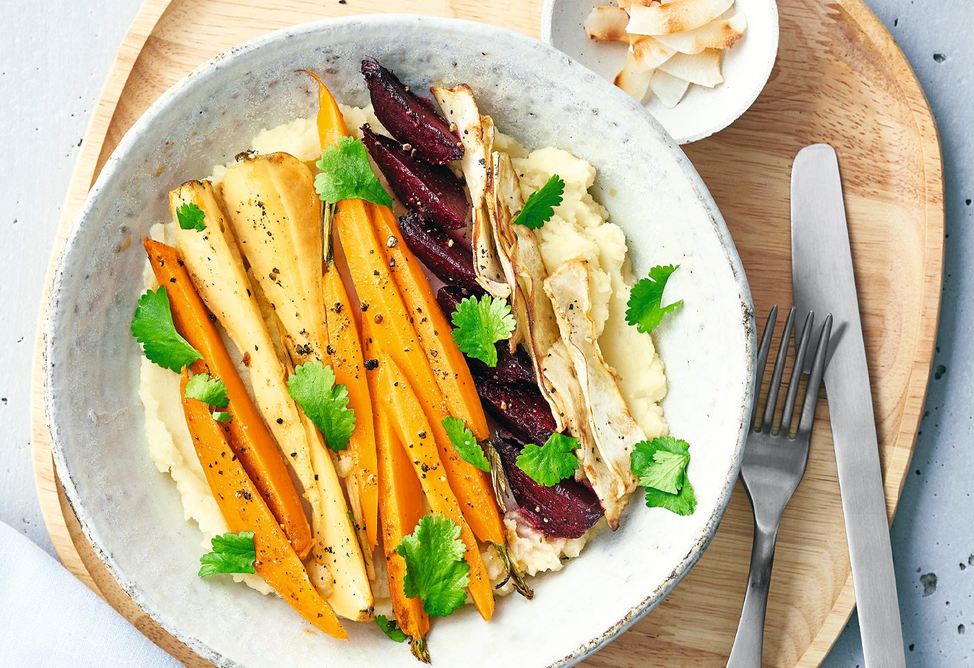 Erdäpfel-Kokos-Bowl mit Wurzelgemüse