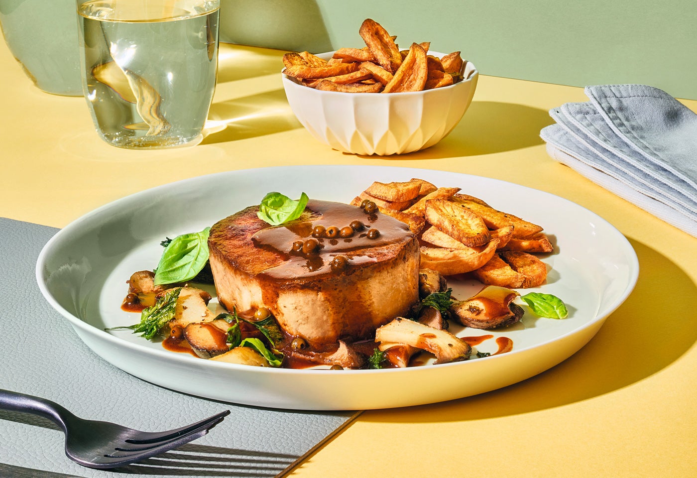 Tofu-Pfeffersteak mit Süßkartoffelpommes und Kräuterseitlingen
