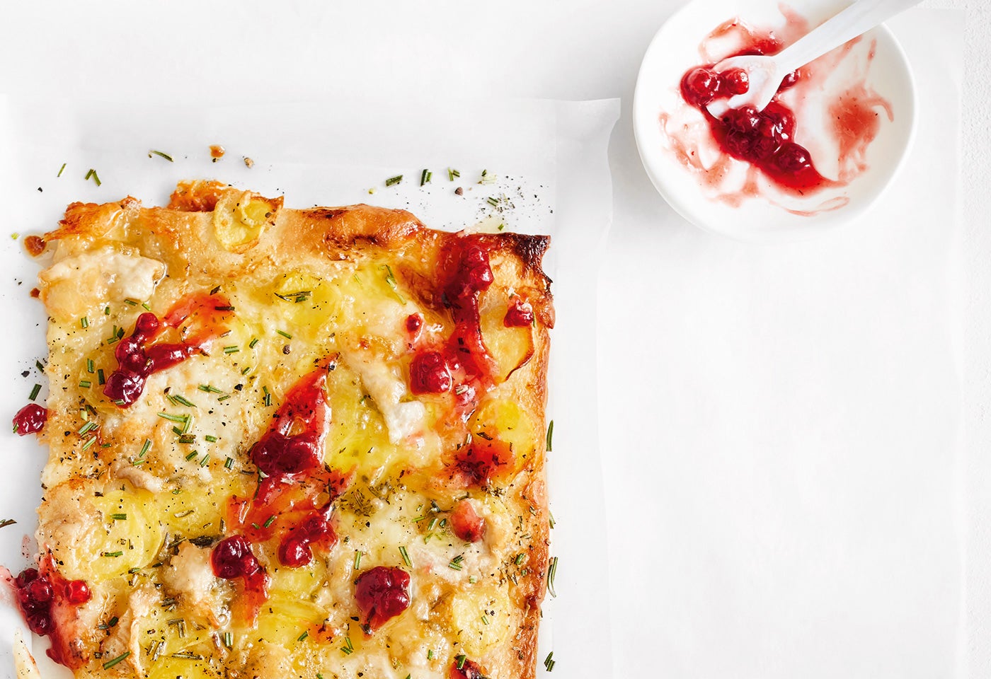Erdäpfelpizza mit Ziegenkäse und Preiselbeeren