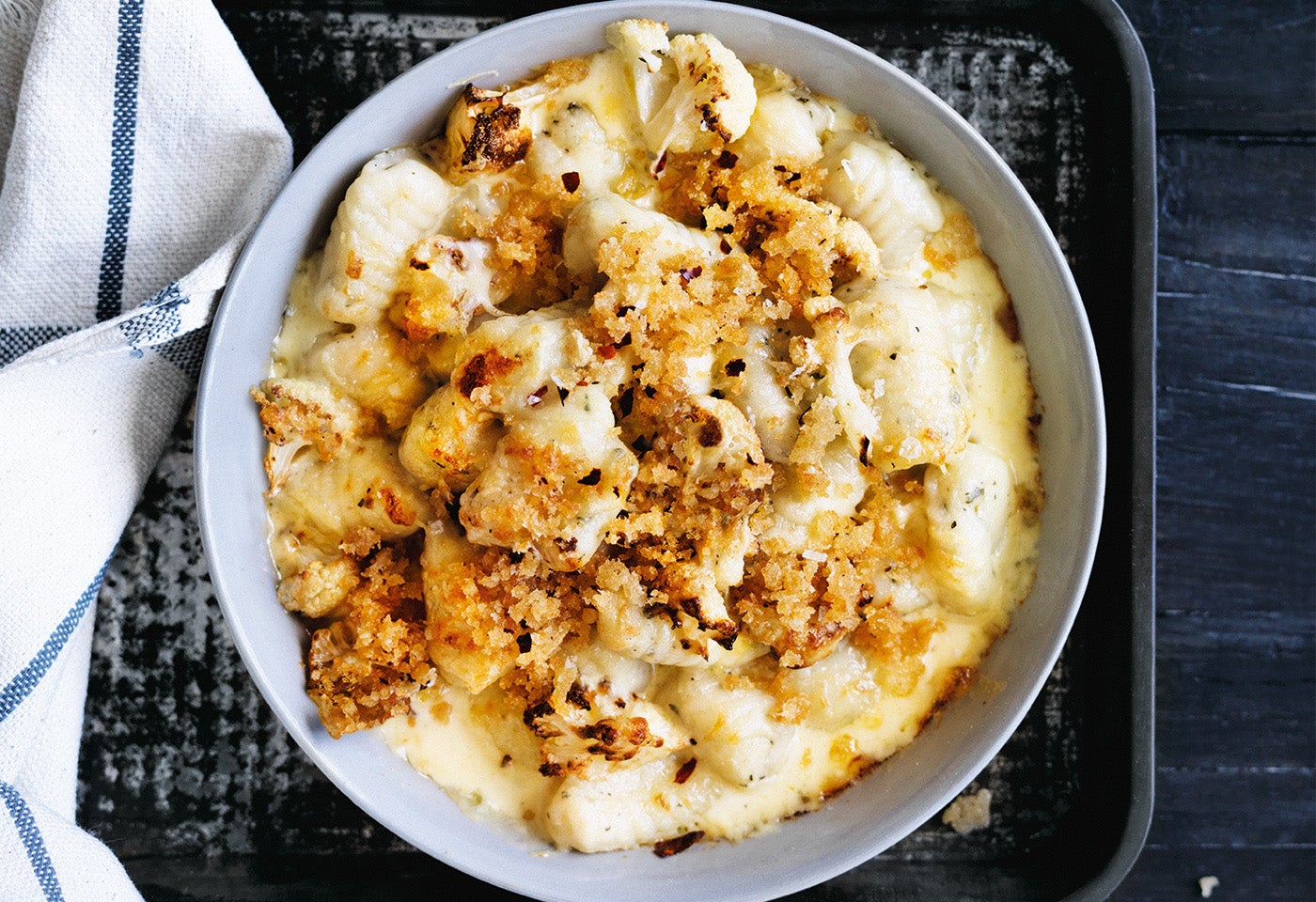 Überbackene Gnocchi mit Karfiol, Käse und Chilibrösel