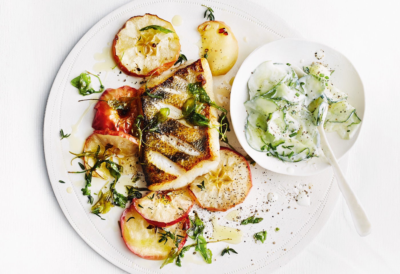 Zander mit Bratapfelscheiben und Gurkensalat
