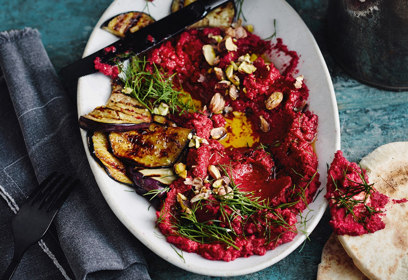 Roter-Rüben-Hummus mit Melanzani und Pitabrot