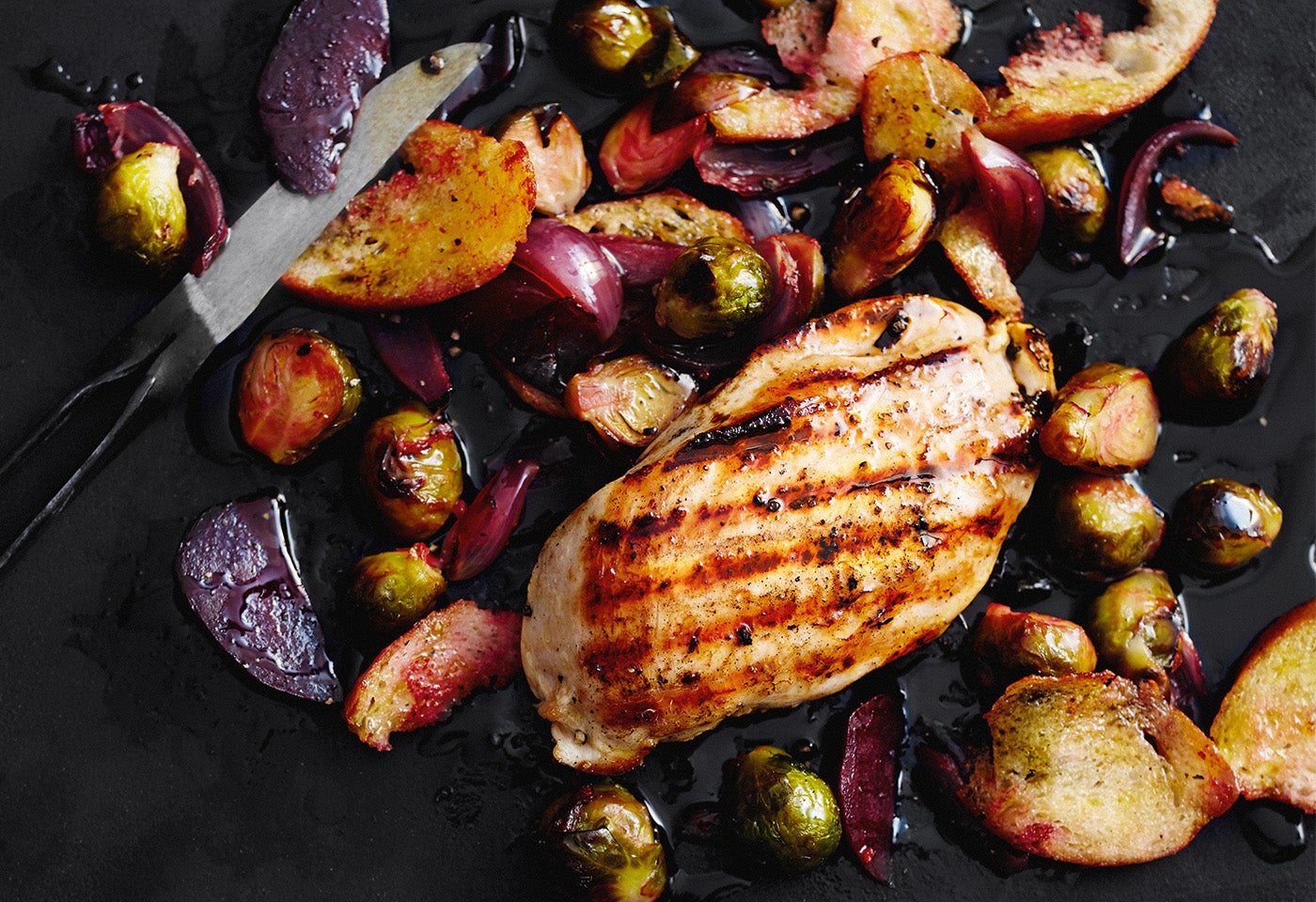 Gegrillte Hühnerbrust mit Ofengemüse und Röstbrot
