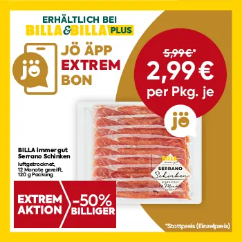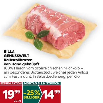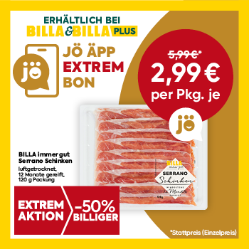 Gültig von Do., 18.12 bis Mi., 24.12.2025. Angebote gültig, solange der Vorrat reicht, exkl. Flascheneinsatz. Ausgenommen: BILLA Online Shop, BILLA CORSO Märkte,BILLA Kleinflächen-Märkte (Wien Hauptbahnhof, Wien Westbahnhof), BILLA stop&shop, BILLA Unterwegs, BILLA Box, VIVA BILLA, BILLA NOW und BILLA TO GO. Abgabe nur in Haushaltsmengen. Generell gilt eine Haushaltsmenge von 10 Einheiten. Die Ausnahme von 5 Einheiten gilt für Dosen-Getränke-24er-Umkartons sowie Haltbarmilch-Kartons. Kein Verkauf an Wiederverkäufer. Preis in Klammern ist die gesetzliche Grundpreisauszeichnung. Statt-Preise sind unsere bisherigen Verkaufspreise. Preise werden kaufmännisch gerundet.