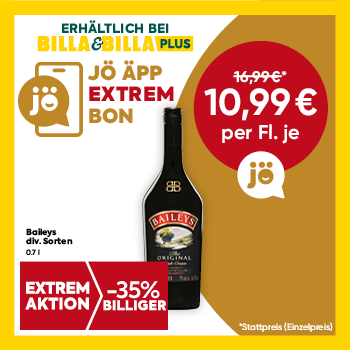 Angebote gültig, solange der Vorrat reicht, exkl. Flascheneinsatz. Ausgenommen: BILLA Online Shop, BILLA CORSO Märkte,BILLA Kleinflächen-Märkte (Wien Hauptbahnhof, Wien Westbahnhof), BILLA stop&shop, BILLA Unterwegs, BILLA Box, VIVA BILLA, BILLA NOW und BILLA TO GO. Abgabe nur in Haushaltsmengen. Generell gilt eine Haushaltsmenge von 10 Einheiten. Die Ausnahme von 5 Einheiten gilt für Dosen-Getränke-24er-Umkartons sowie Haltbarmilch-Kartons. Kein Verkauf an Wiederverkäufer. Preis in Klammern ist die gesetzliche Grundpreisauszeichnung. Statt-Preise sind unsere bisherigen Verkaufspreise. Preise werden kaufmännisch gerundet.