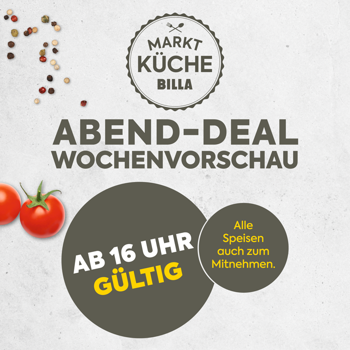 Mit dem Abenddeal erhalten Sie in der BILLA Marktküche von Montag bis Freitag ab 16 Uhr jeden Tag ausgewählte Gerichte zum unschlagbaren Preis. Entdecken Sie unsere Wochenvorschau!