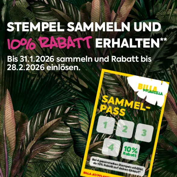 Jetzt Stempel sammeln und 10% Rabatt auf den nächsten Einkauf im BILLA PFLANZILLA erhalten.
