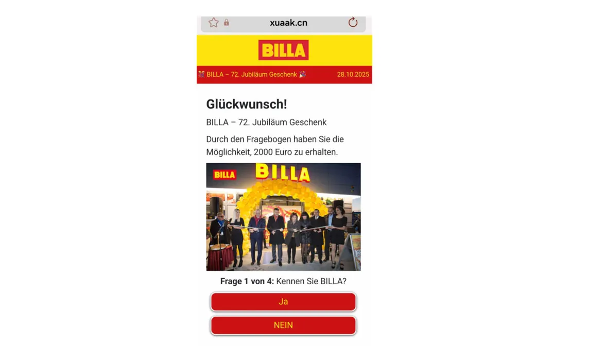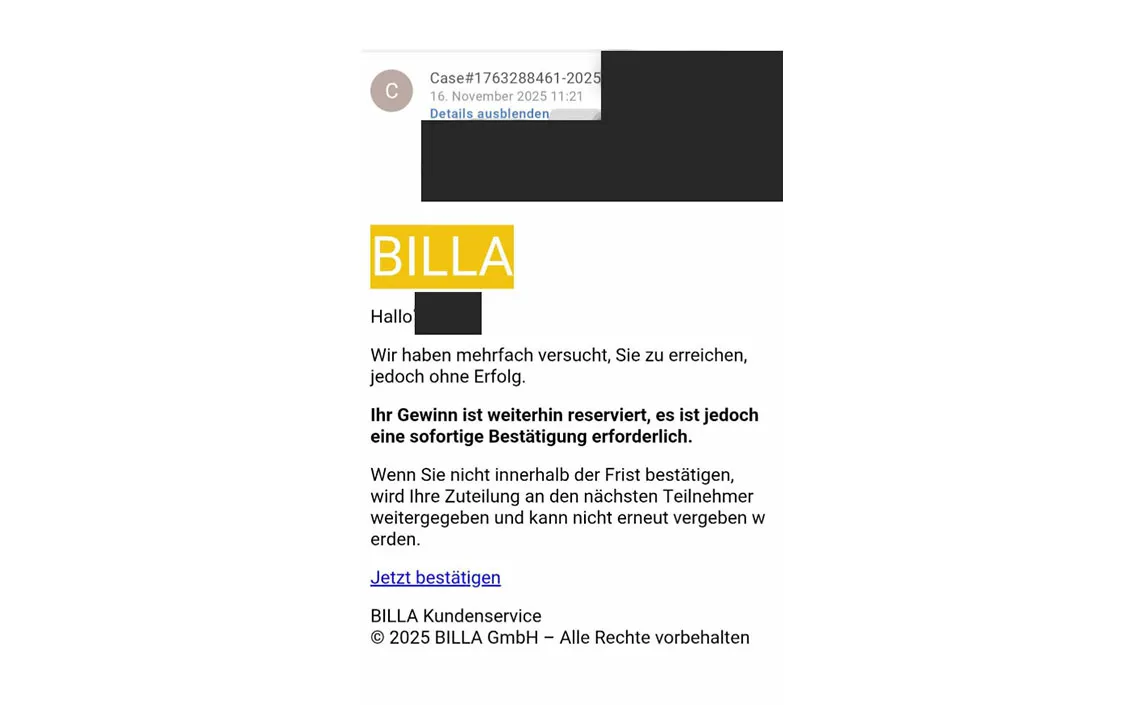 Leider gibt es immer wieder Fake Gewinnspiele im Internet, die teilweise auch im Namen von BILLA AG verbreitet werden, um Daten von Teilnehmer:innen zu erhalten, die dann gewinnbringend verkauft werden können.